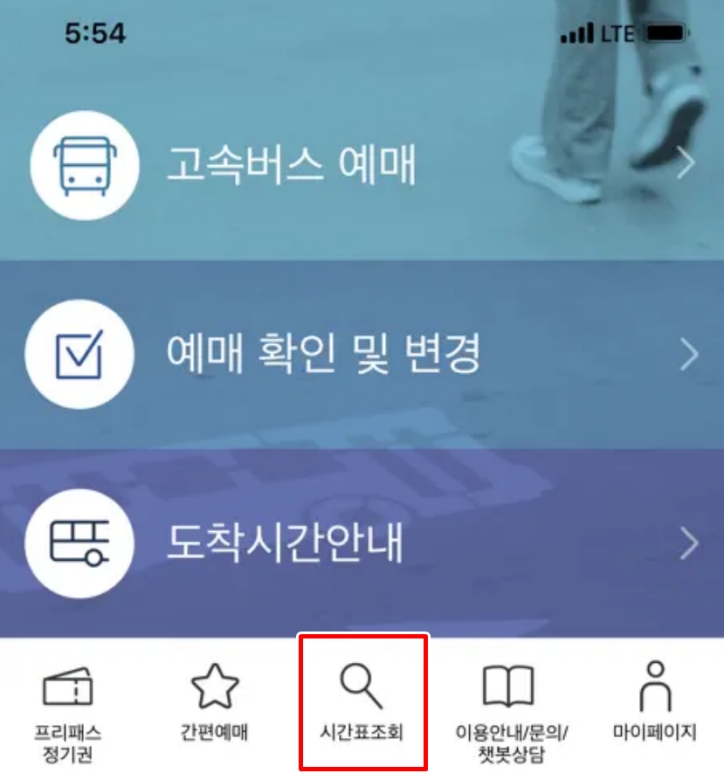 밖에서 이동 중이라 컴퓨터를 쓰기 어려운 상황이라면 전용 어플을 쓰는 것이 가장 빠릅니다. 스마트폰에서 고속버스 티머니 어플 다운로드 후 실행하고 하단에 있는 시간표조회 메뉴를 선택하면 됩니다. 길거리에서 급하게 시간을 확인해야 할 때 이 방법을 써보니 정말 세상이 좋아졌다는 생각이 듭니다.